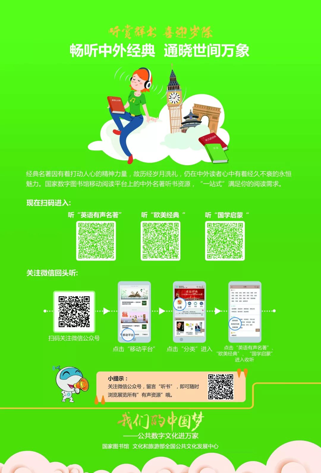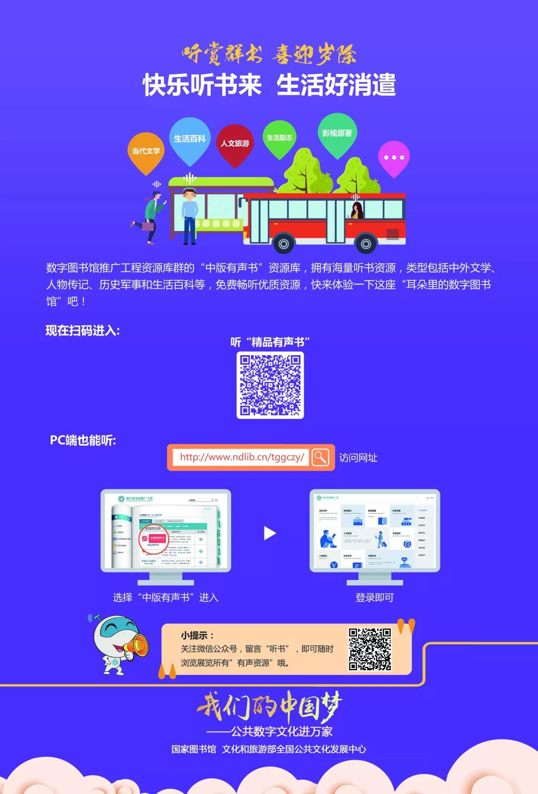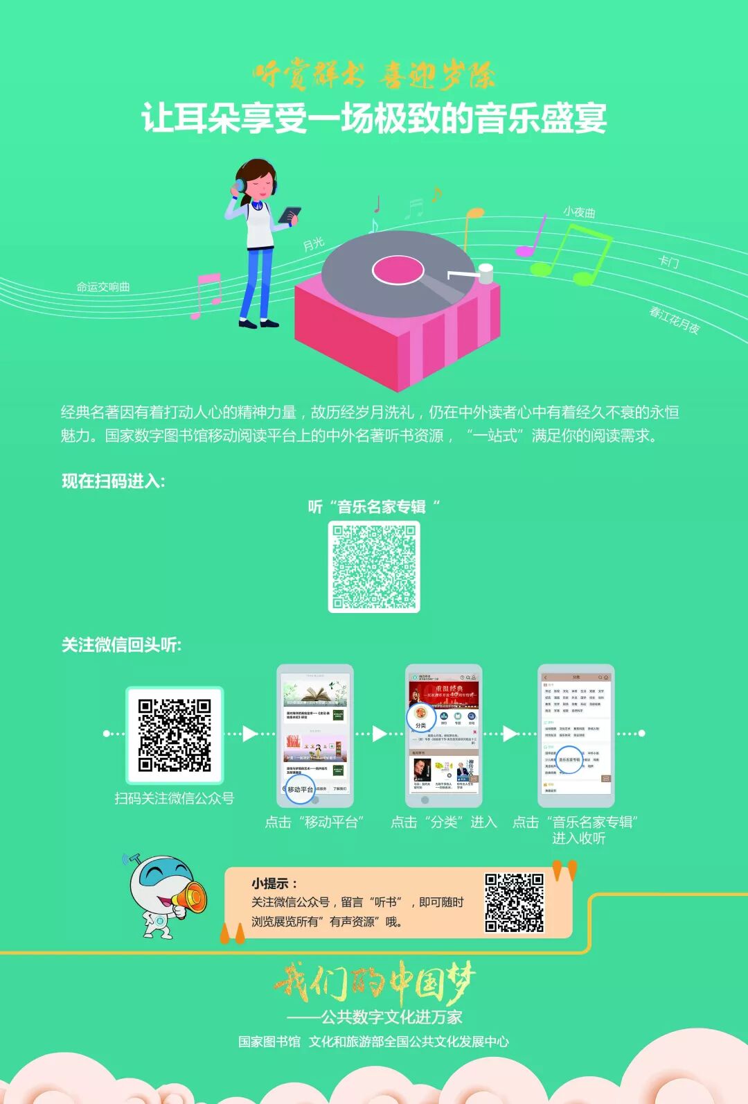 活动将挖掘数字图书馆丰富的有声资源,设计兼具知识性与趣味性的线下主题展览。展览推介内容包括推广工程资源库群及“移动阅读平台”中戏曲、评书、世界名曲、中外童话、有声书等“听书”资源,同时推介喜马拉雅FM“文旅之声”频道资源。