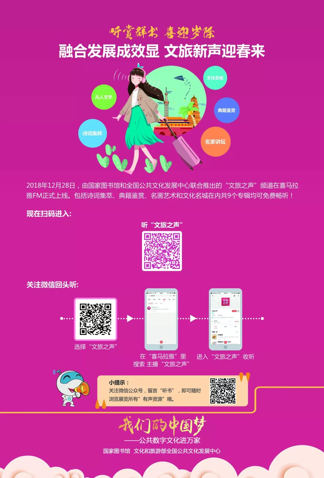 ①2018年12月28日,“文旅之声”频道在喜马拉雅FM正式上线。包括诗词集萃、名画艺术和文化名城在内共9个专辑均可免费收听!详情可按下图的流程操作。