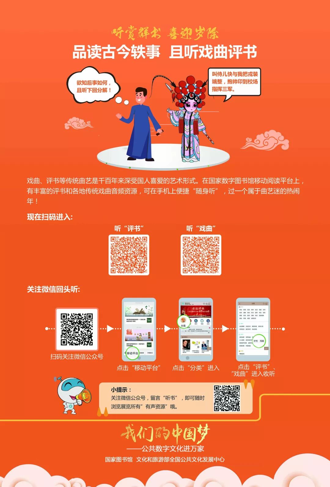 ②戏曲、评书等传统曲艺是千百年来深受国人喜爱的艺术形式。在国家数字图书馆移动阅读平台上,有丰富的评书和各地传统戏曲音频资源,可在手机上随时听,过一个属于曲艺的热闹年!详情可按下图的流程操作。