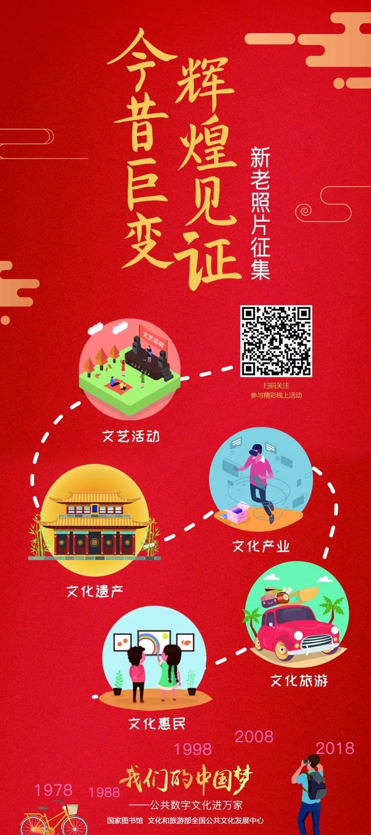 为纪念改革开放40周年,彰显40年来文化领域建设取得的成就,该活动面向全国征集反映文化发展变迁的新老照片,征集主题主要包括文化惠民、文化旅游、文化遗产、文艺活动、文化产业等。活动通过移动端征集平台,让读者同时上传新老照片(老照片可扫描或翻拍成电子图片),并配以文字说明。征集结束后,活动将在3月上旬组织专家评选;3月中下旬进行线上作品展示,并适时开展线下展览扩大宣传,详情可按下图的流程操作。