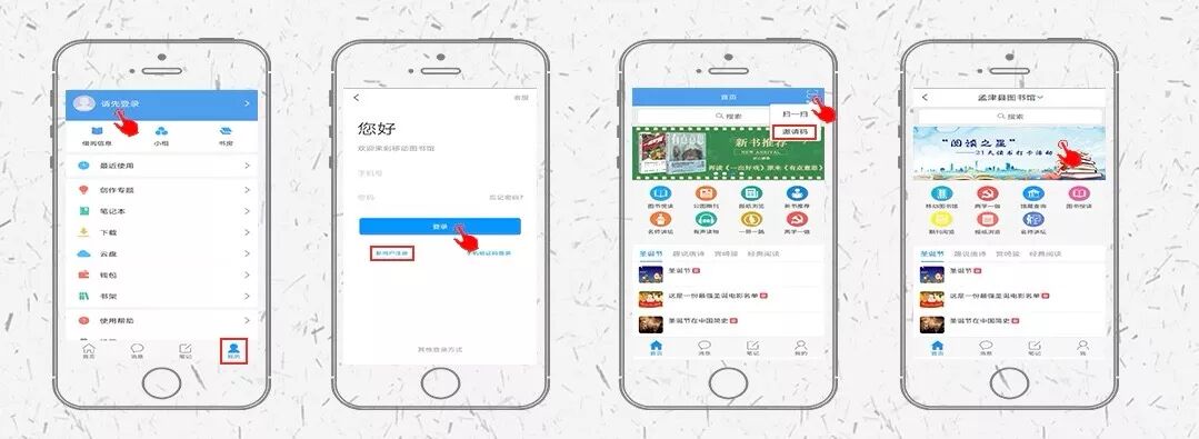 1、扫描上方二维码,下载“移动图书馆”,用手机号注册、登录
